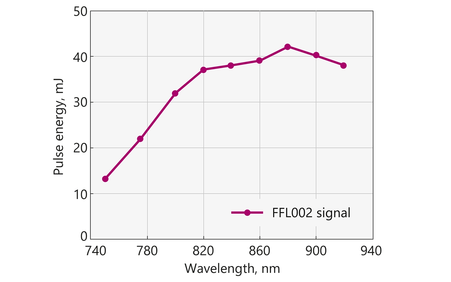 - Maximum pulse energy specified at 840 nm, SH output at 420 nm, TH output at 280 nm and FH output at 210 nm.