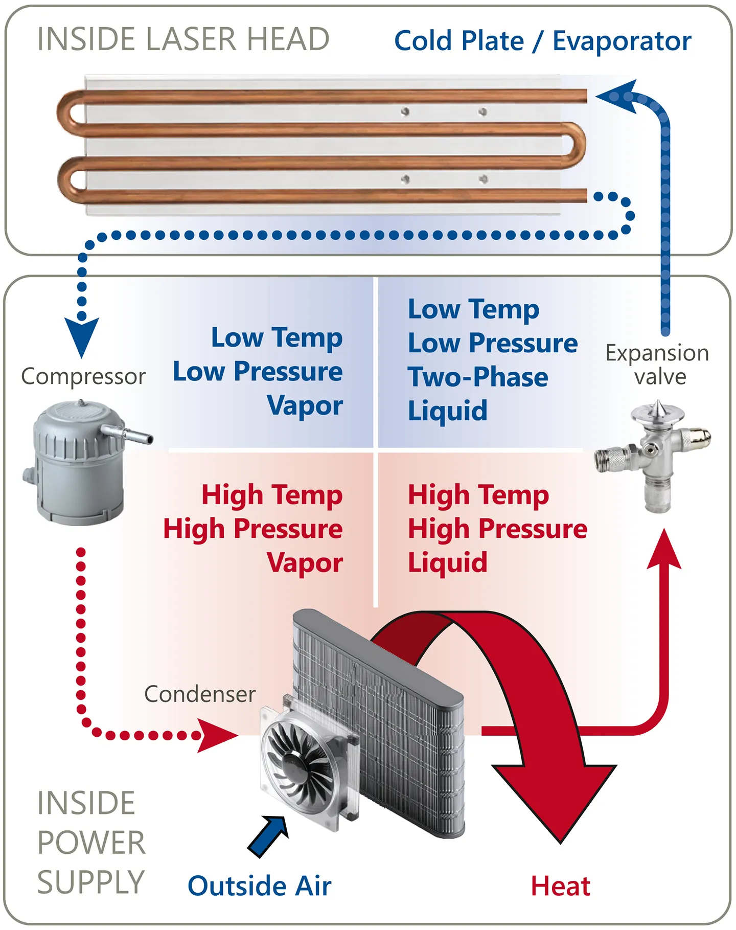 Fundamentally, direct refrigerant cooling (DRC) technology overcomes the reliability issues of pumped liquid loops. Instead of circulating coolant water through a reservoir and pump, refrigerant flows directly through a cold plate in contact with the laser (Figure 4).